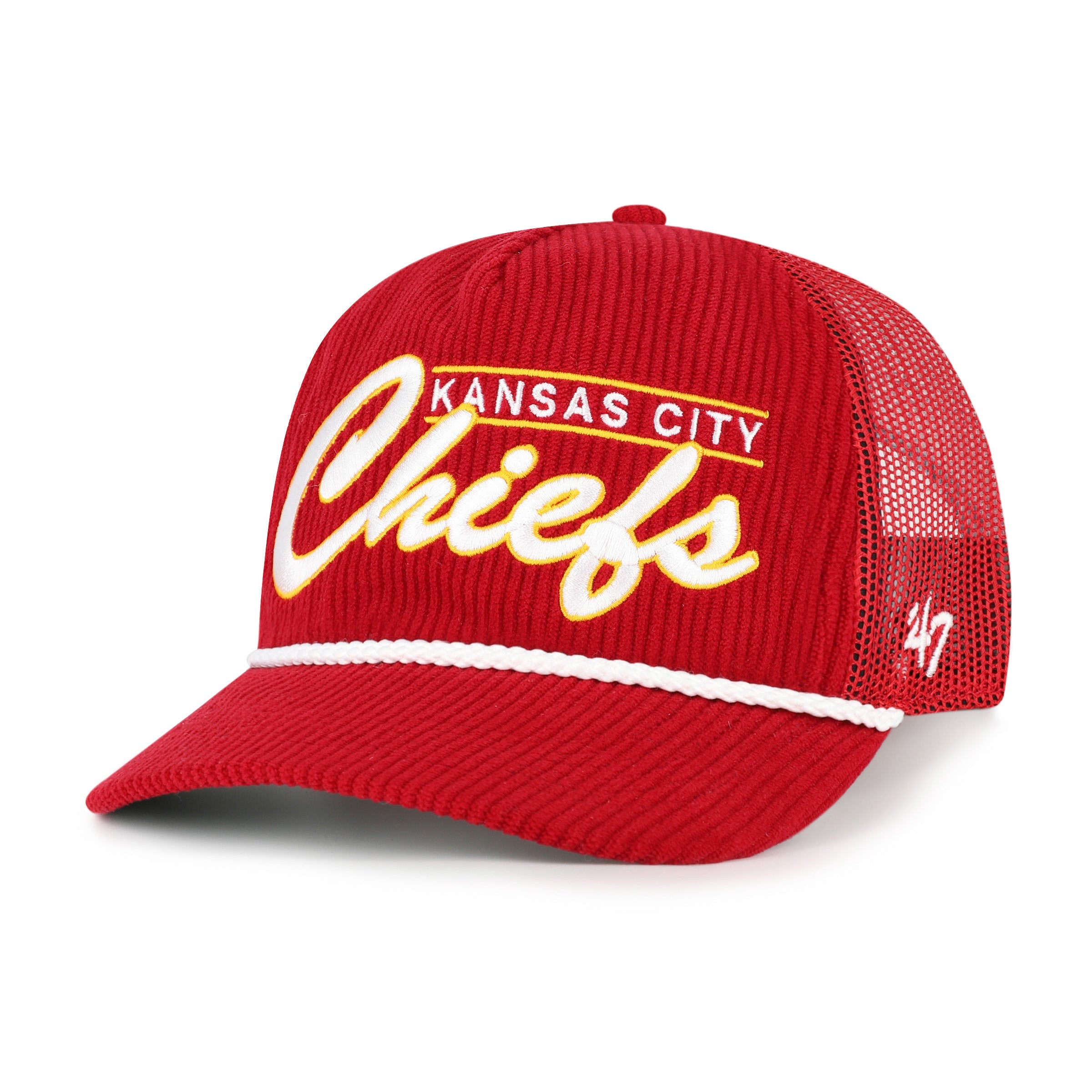 The Double Header Mesh ’47 HITCH RF is a relaxed snapback crafted from premium corduroy and mesh with an embroidered side hit and braided visor rope, for NFL and NCAA teams.